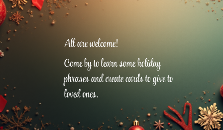 Visit the common area at Haa Shagóon Hídi on December 8, 9, 10 and 11 from 9:30 AM to 11:30 AM to learn some holiday Lingít phrases and make a Christmas card for loved ones.